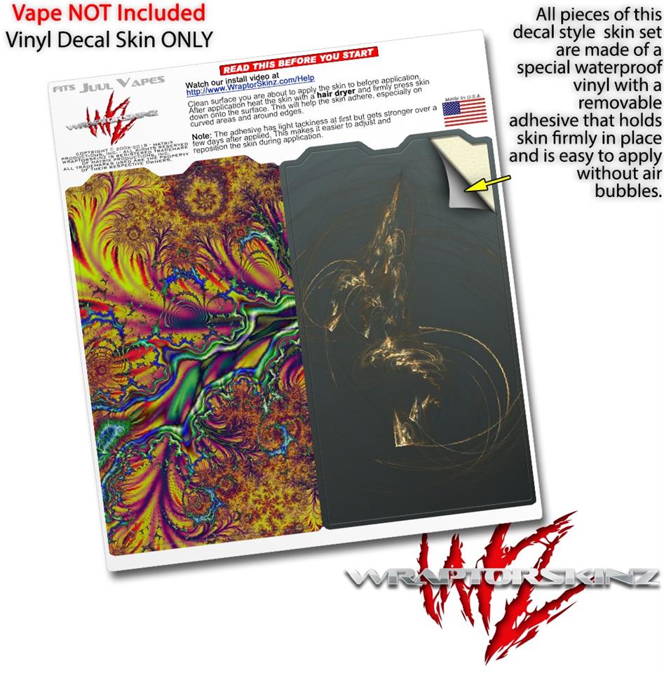 WraptorSkinz® skin wraps are printed using superb photo quality designs and vibrant colors printed with special fade resistant inks that last even in direct sun for years. WraptorSkinz are a composite of two layers of commercial grade materials. The bottom layer is a soft, flexible vinyl with a special removable adhesive that is easily positioned, applied without air bubbles. Next we print the bottom layer with UV protected, fade resistant inks that deliver superb photo quality designs in vibrant colors. Finally we bond a professional grade laminate over the entire skin adding a glossy protective finish. This product is not affiliated with or endorsed by the Juul brand.