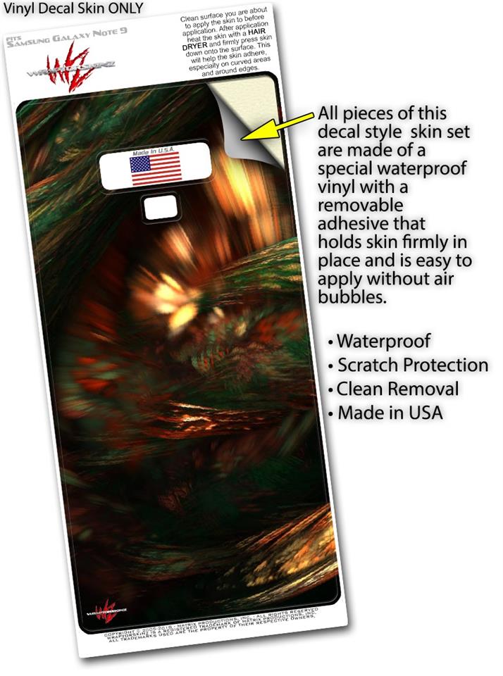 WraptorSkinz® skin wraps for the Samsung Galaxy Note 9 are printed using superb photo quality designs and vibrant colors printed with special fade resistant inks that last even in direct sun for years. WraptorSkinz are a composite of two layers of commercial grade materials. The bottom layer is a soft, flexible vinyl with a special removable adhesive that is easily positioned, applied without air bubbles. Next, we print the bottom layer with UV protected, fade resistant inks that deliver superb photo quality designs in vibrant colors. Finally, we bond a professional grade laminate over the entire Galaxy Note 9 skin adding a glossy protective finish. This product is not affiliated with or endorsed by Samsung.