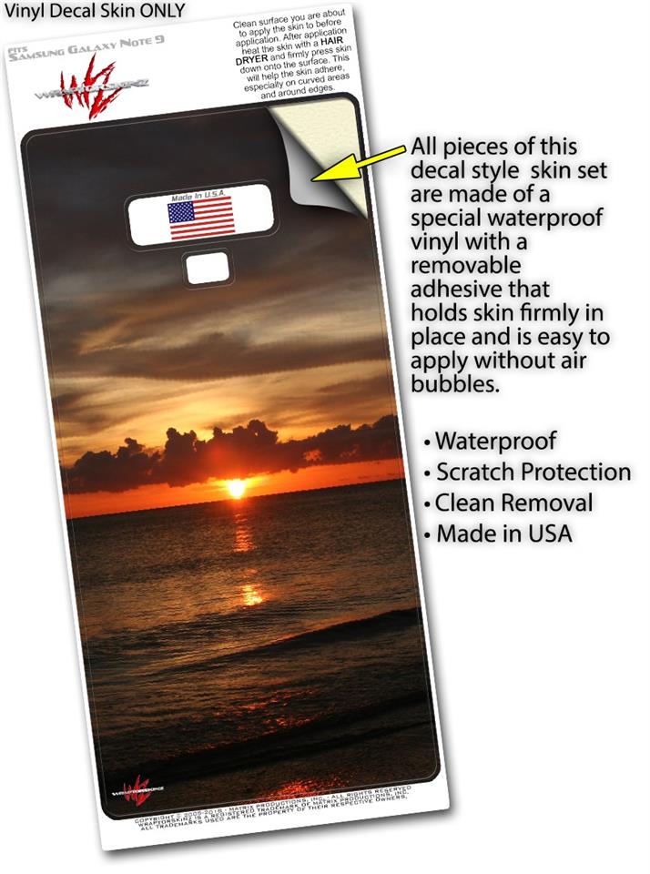 WraptorSkinz® skin wraps for the Samsung Galaxy Note 9 are printed using superb photo quality designs and vibrant colors printed with special fade resistant inks that last even in direct sun for years. WraptorSkinz are a composite of two layers of commercial grade materials. The bottom layer is a soft, flexible vinyl with a special removable adhesive that is easily positioned, applied without air bubbles. Next, we print the bottom layer with UV protected, fade resistant inks that deliver superb photo quality designs in vibrant colors. Finally, we bond a professional grade laminate over the entire Galaxy Note 9 skin adding a glossy protective finish. This product is not affiliated with or endorsed by Samsung.