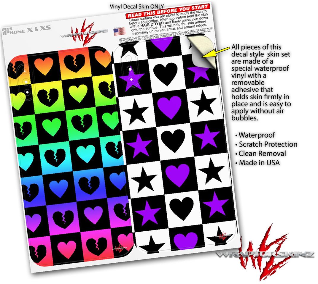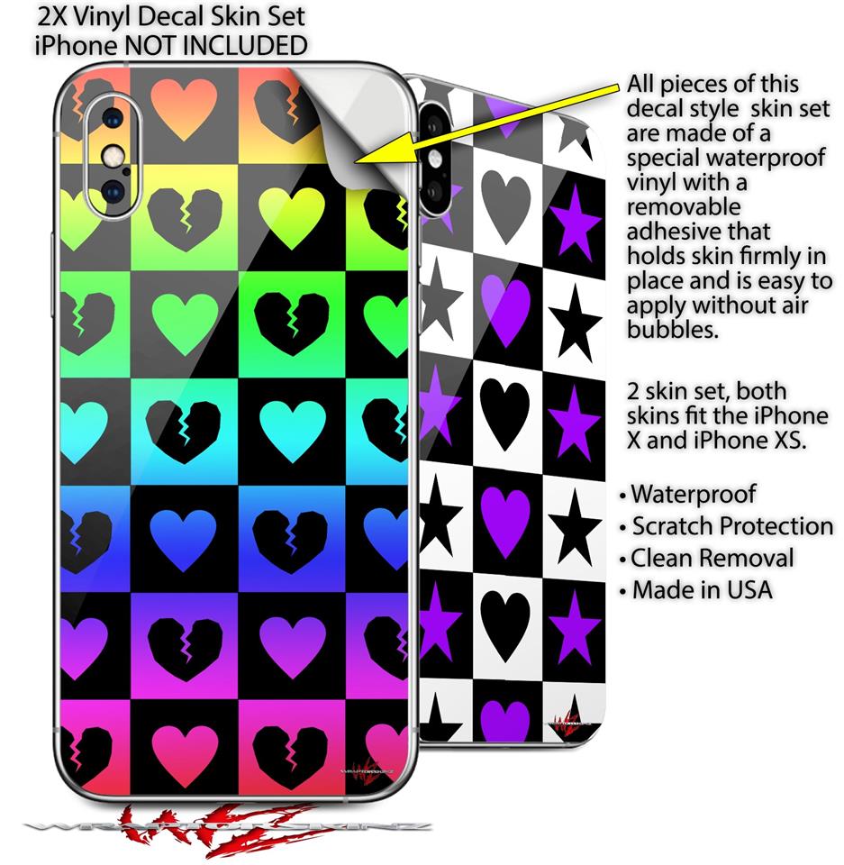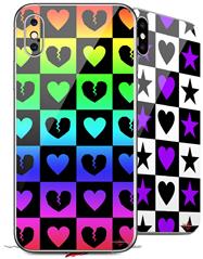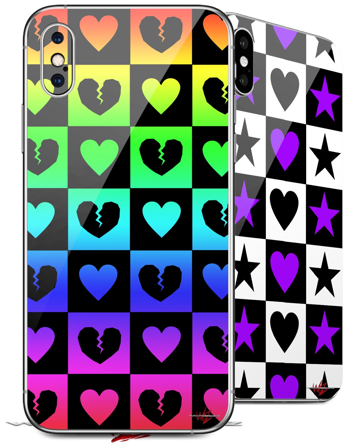 2 Decal style Skin Wraps set for Apple iPhone X and XS Love Heart Checkers Rainbow