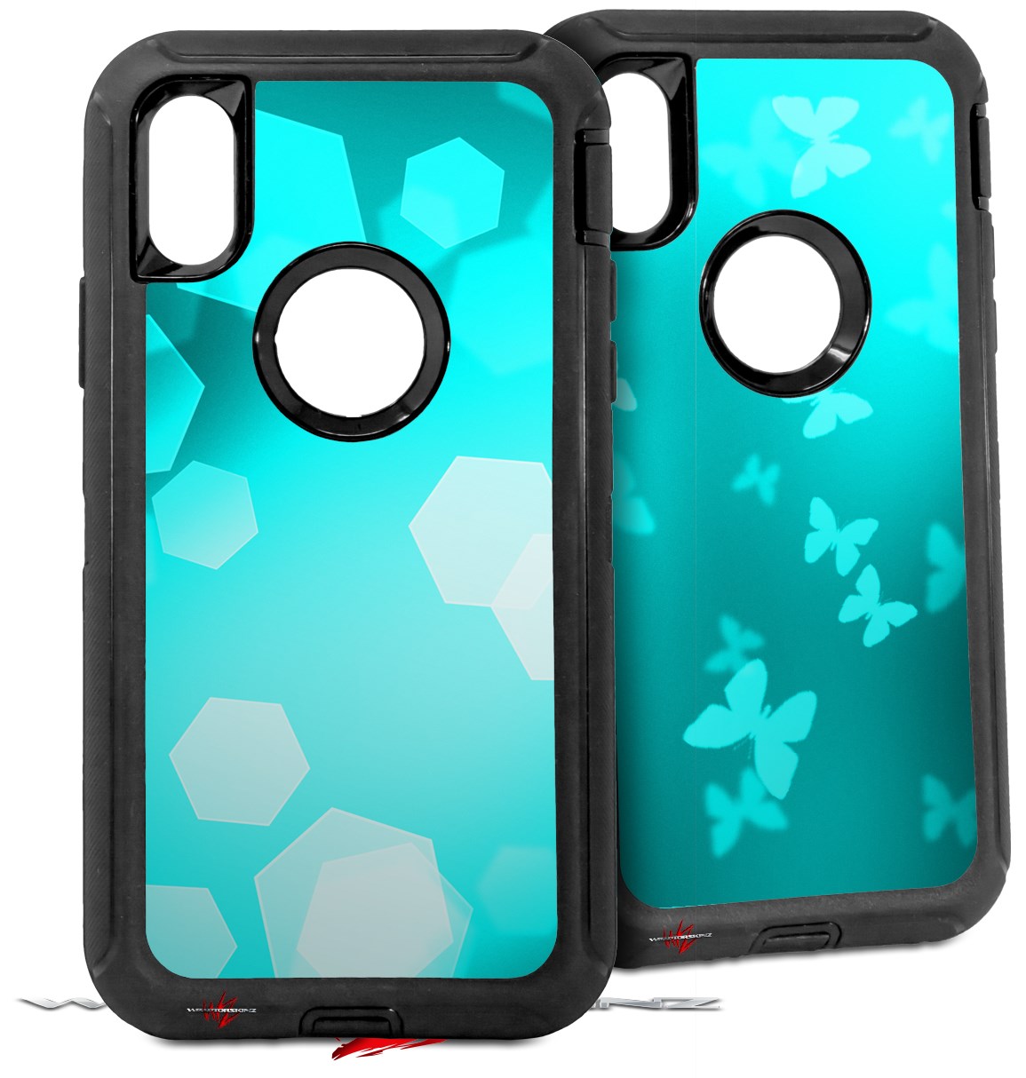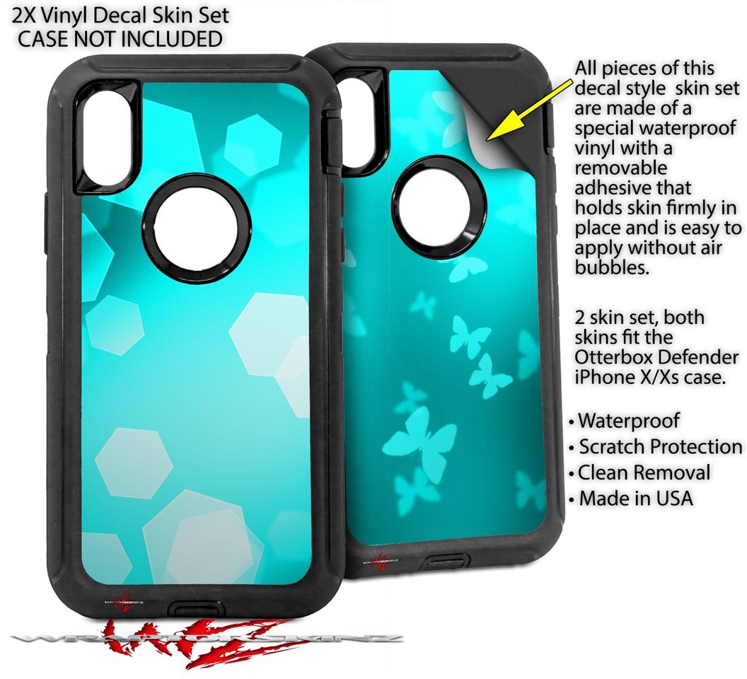 2x Decal style Skin Wrap Set compatible with Otterbox Defender iPhone X and Xs Case - Bokeh Hex Neon Teal (CASE NOT INCLUDED)
