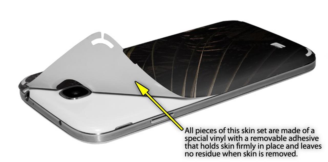 • Decal style vinyl skin covers front and back of Samsung Galaxy S4 phone.