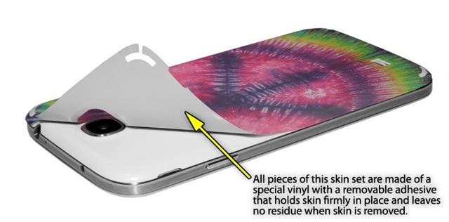 • Decal style vinyl skin covers front and back of Samsung Galaxy S4 phone.