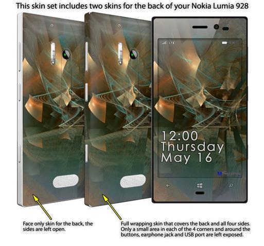 • Decal style vinyl skin covers front, back and side of Nokia Lumia 928 phone.