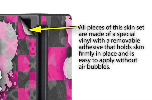 WraptoSkinz™ skins are superb photo quality designs and vibrant colors printed with special Eco-Friendly, fade resistant inks. Our skins are self-adhering flexible vinyl skins that helps prevent scratches. Made of composite, multi-layered commercial grade materials. The bottom layer is made with a special removable adhesive that is easily positioned and applied without air bubbles. We print your design on the bottom layer then bond a professional grade laminate over the entire skin adding a glossy protective finish.