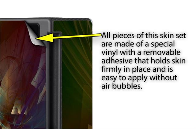 WraptoSkinz™ skins are superb photo quality designs and vibrant colors printed with special Eco-Friendly, fade resistant inks. Our skins are self-adhering flexible vinyl skins that helps prevent scratches. Made of composite, multi-layered commercial grade materials. The bottom layer is made with a special removable adhesive that is easily positioned and applied without air bubbles. We print your design on the bottom layer then bond a professional grade laminate over the entire skin adding a glossy protective finish.