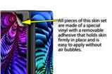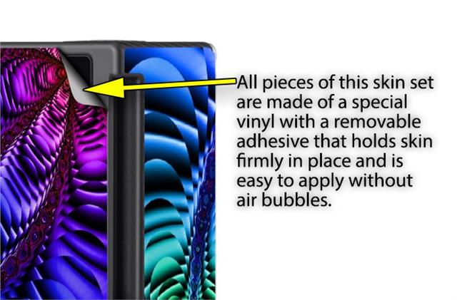 WraptoSkinz™ skins are superb photo quality designs and vibrant colors printed with special Eco-Friendly, fade resistant inks. Our skins are self-adhering flexible vinyl skins that helps prevent scratches. Made of composite, multi-layered commercial grade materials. The bottom layer is made with a special removable adhesive that is easily positioned and applied without air bubbles. We print your design on the bottom layer then bond a professional grade laminate over the entire skin adding a glossy protective finish.