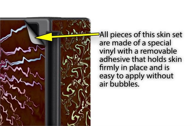WraptoSkinz™ skins are superb photo quality designs and vibrant colors printed with special Eco-Friendly, fade resistant inks. Our skins are self-adhering flexible vinyl skins that helps prevent scratches. Made of composite, multi-layered commercial grade materials. The bottom layer is made with a special removable adhesive that is easily positioned and applied without air bubbles. We print your design on the bottom layer then bond a professional grade laminate over the entire skin adding a glossy protective finish.