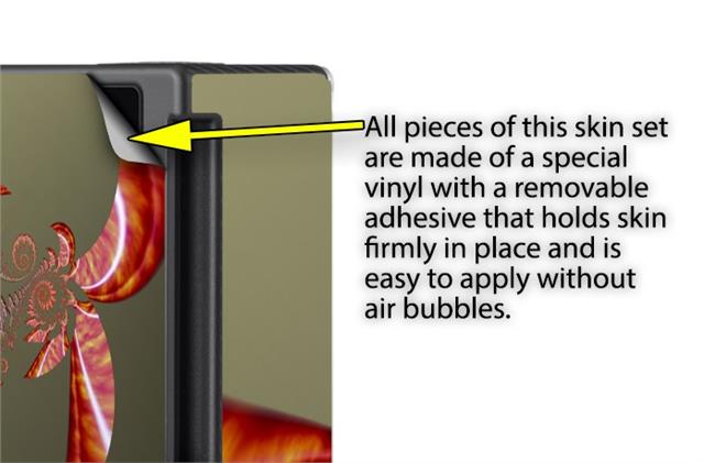 WraptoSkinz™ skins are superb photo quality designs and vibrant colors printed with special Eco-Friendly, fade resistant inks. Our skins are self-adhering flexible vinyl skins that helps prevent scratches. Made of composite, multi-layered commercial grade materials. The bottom layer is made with a special removable adhesive that is easily positioned and applied without air bubbles. We print your design on the bottom layer then bond a professional grade laminate over the entire skin adding a glossy protective finish.