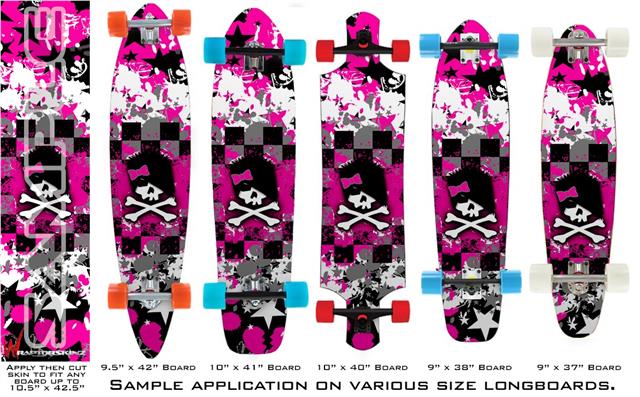 Our longboard skins are made so that one size fits boards up to 10” wide x 42” long. This means after applying the skin it you will trimming to fit you’re the shape of your board with a sharp utility knife.