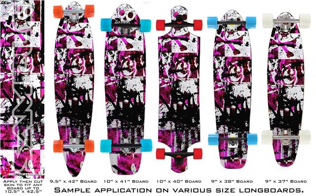 Our longboard skins are made so that one size fits boards up to 10” wide x 42” long. This means after applying the skin it you will trimming to fit you’re the shape of your board with a sharp utility knife.