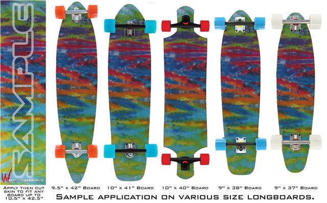 Our longboard skins are made so that one size fits boards up to 10” wide x 42” long. This means after applying the skin it you will trimming to fit you’re the shape of your board with a sharp utility knife.