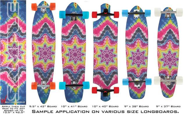 Our longboard skins are made so that one size fits boards up to 10” wide x 42” long. This means after applying the skin it you will trimming to fit you’re the shape of your board with a sharp utility knife.