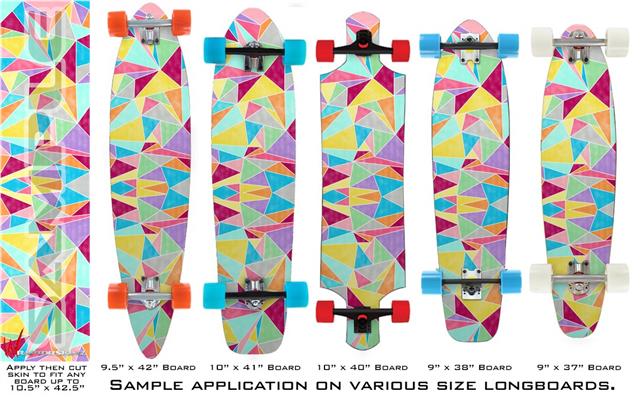 Our longboard skins are made so that one size fits boards up to 10” wide x 42” long. This means after applying the skin it you will trimming to fit you’re the shape of your board with a sharp utility knife.