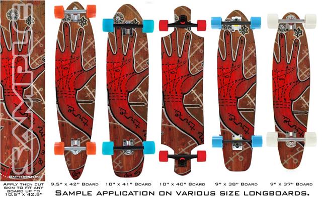 Our longboard skins are made so that one size fits boards up to 10” wide x 42” long. This means after applying the skin it you will trimming to fit you’re the shape of your board with a sharp utility knife.