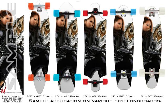Our longboard skins are made so that one size fits boards up to 10” wide x 42” long. This means after applying the skin it you will trimming to fit you’re the shape of your board with a sharp utility knife.