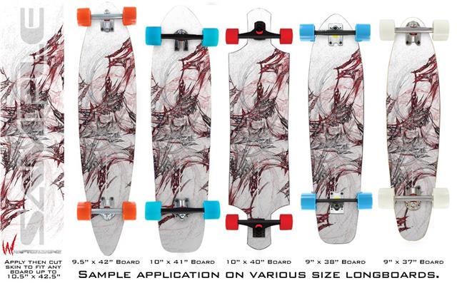 Our longboard skins are made so that one size fits boards up to 10” wide x 42” long. This means after applying the skin it you will trimming to fit you’re the shape of your board with a sharp utility knife.