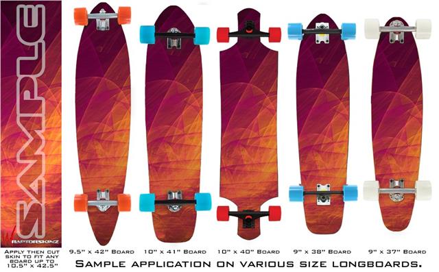 Our longboard skins are made so that one size fits boards up to 10” wide x 42” long. This means after applying the skin it you will trimming to fit you’re the shape of your board with a sharp utility knife.