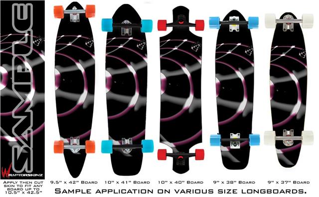 Our longboard skins are made so that one size fits boards up to 10” wide x 42” long. This means after applying the skin it you will trimming to fit you’re the shape of your board with a sharp utility knife.