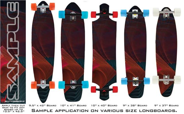 Our longboard skins are made so that one size fits boards up to 10” wide x 42” long. This means after applying the skin it you will trimming to fit you’re the shape of your board with a sharp utility knife.