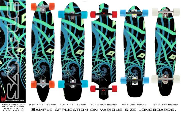 Our longboard skins are made so that one size fits boards up to 10” wide x 42” long. This means after applying the skin it you will trimming to fit you’re the shape of your board with a sharp utility knife.