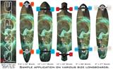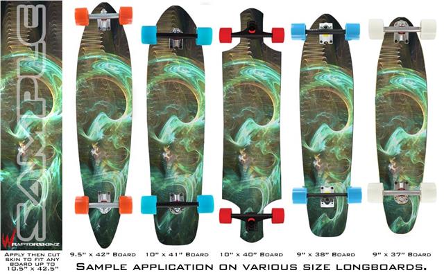 Our longboard skins are made so that one size fits boards up to 10” wide x 42” long. This means after applying the skin it you will trimming to fit you’re the shape of your board with a sharp utility knife.