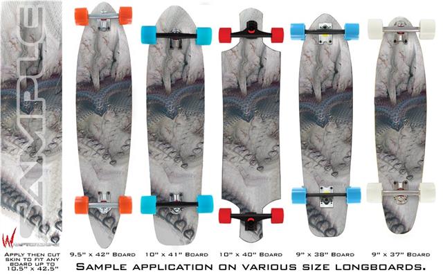 Our longboard skins are made so that one size fits boards up to 10” wide x 42” long. This means after applying the skin it you will trimming to fit you’re the shape of your board with a sharp utility knife.