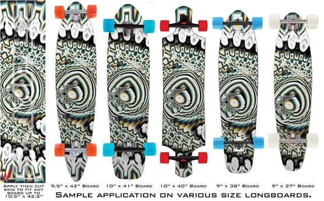 Our longboard skins are made so that one size fits boards up to 10” wide x 42” long. This means after applying the skin it you will trimming to fit you’re the shape of your board with a sharp utility knife.