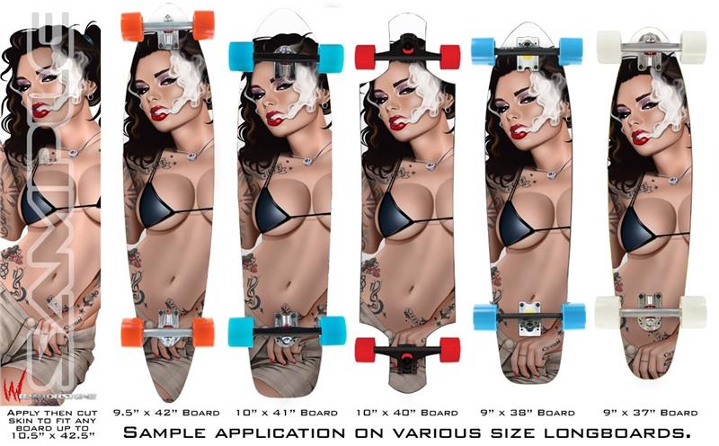 Our longboard skins are made so that one size fits boards up to 10” wide x 42” long. This means after applying the skin it you will trimming to fit you’re the shape of your board with a sharp utility knife.