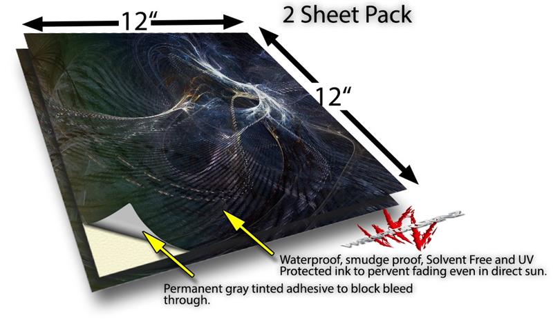 WraptoSkinz™ skin vinyl craft sheets are printed using superb photo quality designs and vibrant colors printed with special UV Protected fade resistant inks that last even in direct sun for years. Unlike other brands our inks are NOT solvent based. WraptorSkinz are a manufactured from professional grade 3mill vinyl. These sheets are waterproof, the designs will not run or smear even if submerged in water.