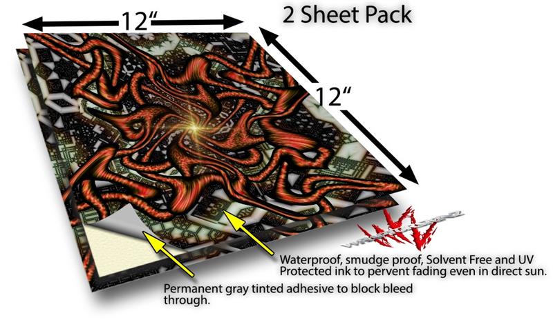 WraptoSkinz™ skin vinyl craft sheets are printed using superb photo quality designs and vibrant colors printed with special UV Protected fade resistant inks that last even in direct sun for years. Unlike other brands our inks are NOT solvent based. WraptorSkinz are a manufactured from professional grade 3mill vinyl. These sheets are waterproof, the designs will not run or smear even if submerged in water.