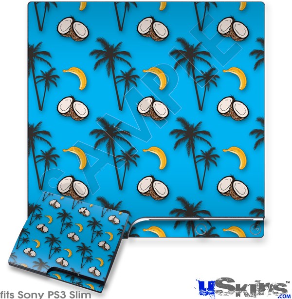 Decal Skin compatible with Sony PS3 Slim Coconuts Palm Trees and Bananas Blue Medium